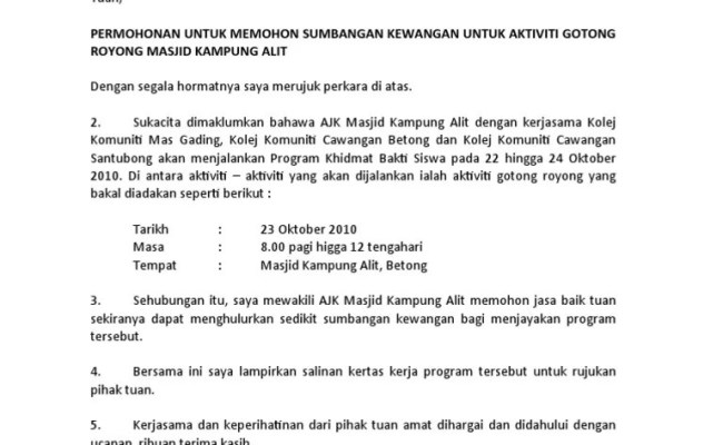 Permohonan bantuan kewangan dari zakat selangor (rm500 sekali sahaja). Contoh surat » surat permohonan » contoh surat permohonan bantuan dana pembangunan maklum gan, karena keterbatasan html. Berikut contoh surat permohonan dana kegiatan hut ri untuk meminta bantuan dana pada masyarakat maka dari itu kami mohon partisipasi dari seluruh warga rw 06 perum lovina village untuk dapat menyisihkan sedikit materinya, agar acara dan hajat warga dapat berjalan dengan lancar. Contoh surat rasmi memohon sumbangan buku contoh 36 via contoh36.blogspot.com. Diharap yang berhormat adun dapat meluluskan peruntukan tersebut demi kepentingan pedidikan anggaran semua kos peruntukan adalah sebanyak rm45000 ( empat ribu lima ratus sahaja).kertas kerja adalah seperti lampiran 1 berkembar.